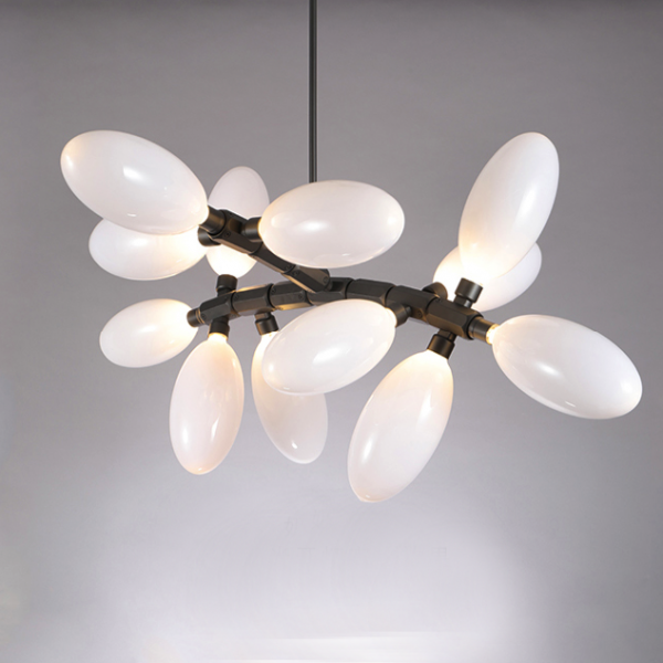 Каждая люстра состоит из большого количества плафонов нанизанных на алюминиевые подвижные позвонки. Что дает возможность видоизменять люстру, давать ей естественное ниспадание. Каждый плафон выдувается вручную - что дает особенное, в полном смысле этого слова, неповторимое, изящество.